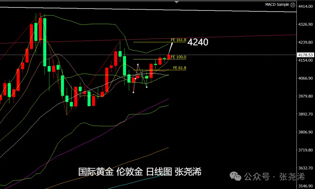 日图;金价近期保持中轨支撑上方持续震荡调整,低点上移,目前也再度持稳于30日等均线上方,布林带也开口向上延伸,多头占据优势,前景看涨预期加大,下方则关注5日均线及中轨线支撑等继续看涨为主,短期上方等待再度上探4240-4260美元或4380美元目标。