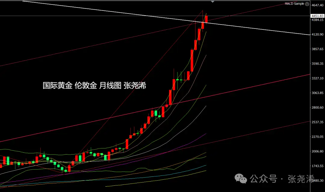 反之,如本月再度收取倒垂至趋势线之内,则需留意后市有再度展开较大回调,去回踩4000-3900美元区域或更低位置的风险;